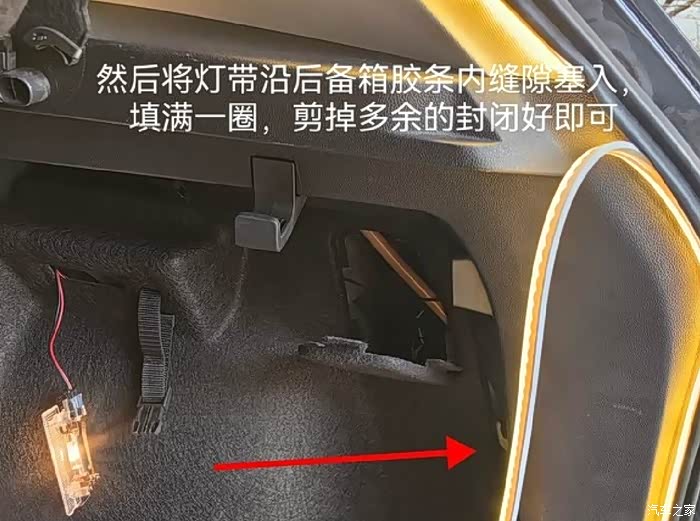 将灯带沿着后备箱外圈缝隙嵌入,多余部分剪掉并做好绝缘处理。