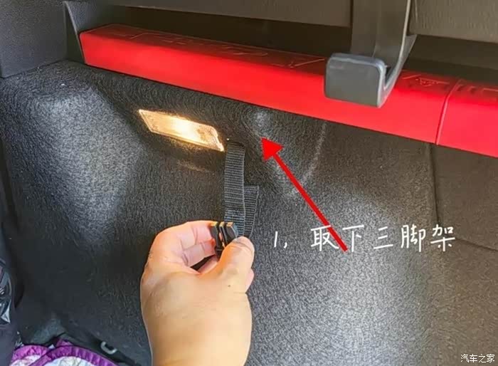 用引导线缠住电源插头,从尾箱后门与三脚架平行的位置穿入。