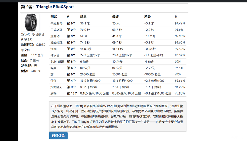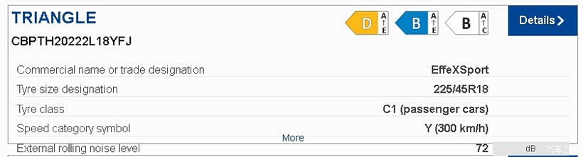 225/45/18的规格,三角TH202欧盟官方标识DBB,这B级的湿地抓地力还能排到第九,还是可以的。换TH202其他规格大部分都是CAB,还更能打一些。