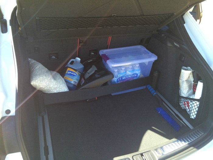 平时的后备箱,没怎么收拾,选配了那个后备箱固定,挺好用,两个格挡,一个硬的,一个这种软布条的,布条的很方便,收起来的时候很省地方。并且对于暴力驾驶的车友很实用!