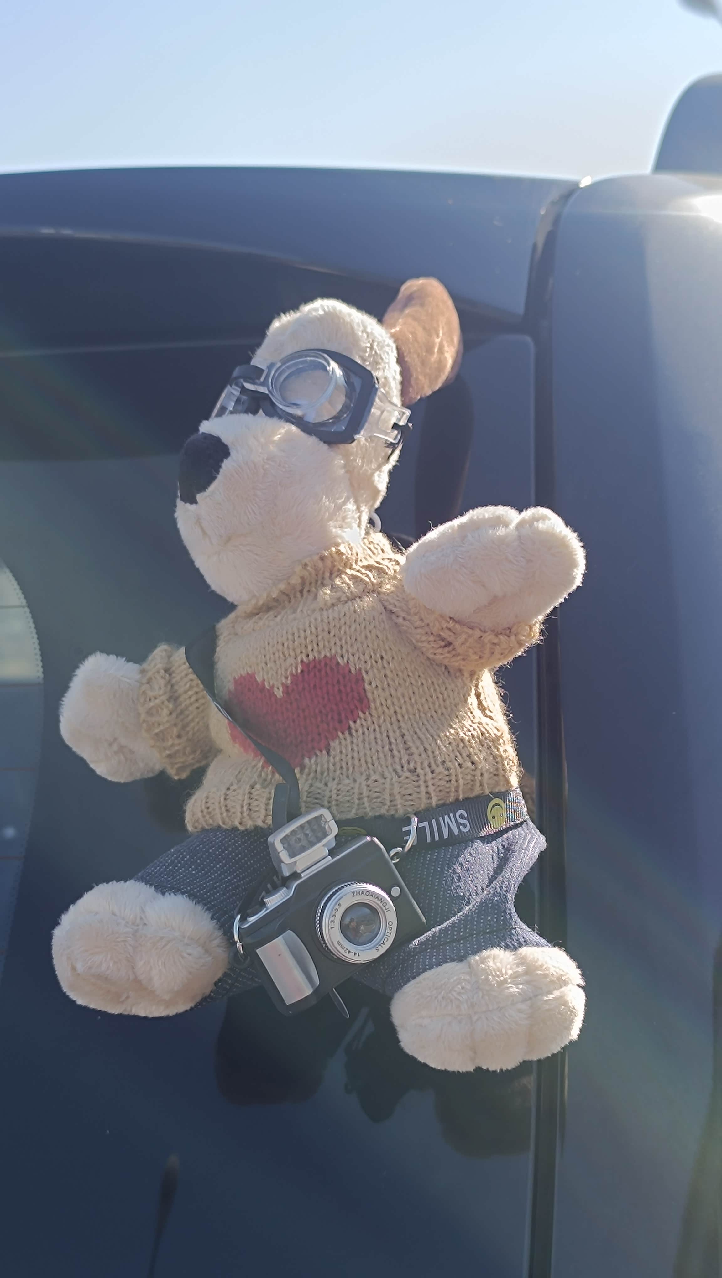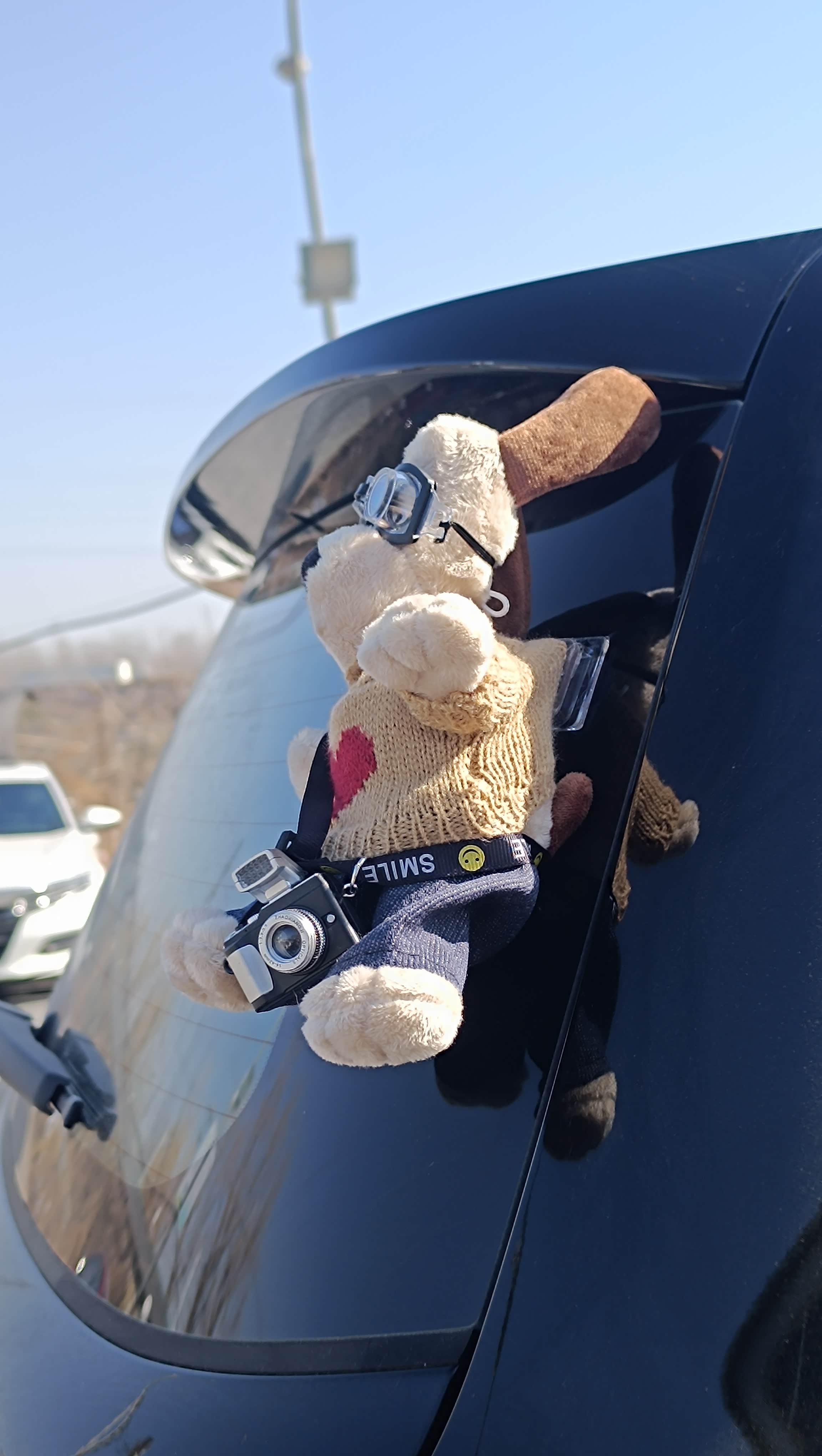 网上买的大狗玩偶,怕伤车漆,就直接贴在后窗了。不到三天就被偷走了