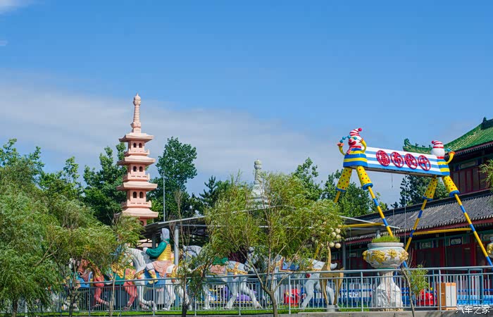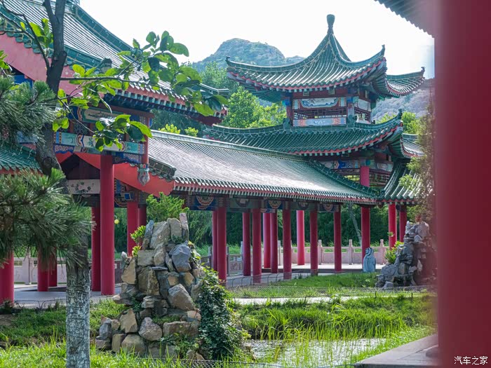 穿过一座古色古香的长廊,便正式进入了隆霞湖景区,从桥上向湖面看去,清澈见底的湖水,湖底的水草随着水波摇曳的身姿都能尽收眼里。在隆霞湖,不仅仅有姿态万千的动物雕塑,还有着煞是好看的古建筑。朱砂色的柱子,绿色的琉璃瓦,精细的梁画,像极了在古代宫廷剧中才会出现的场景。