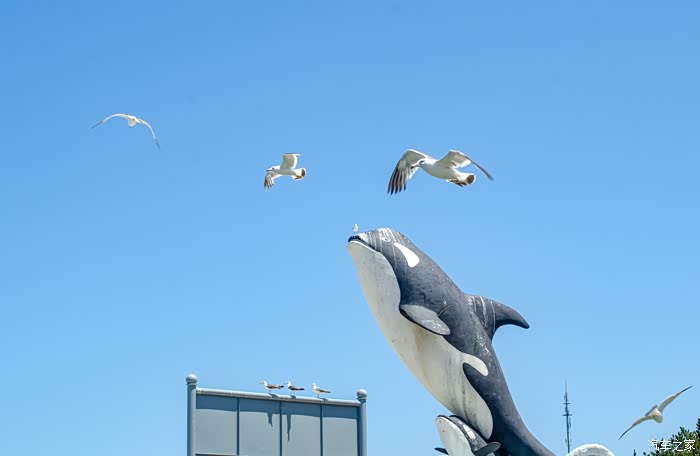 从山林之间来到滨海之畔,这里是海洋动物世界,各种各样的海洋动物水池沿着海岸线一字排开,在海洋动物的入口处则矗立着一个巨大的海豚的雕塑,雕塑的周围不断得有海鸥在盘旋。生活在这里的海洋动物是幸福的,纯自然的海洋生活环境,真正的海水,还有着每天定时定量的新鲜食物。