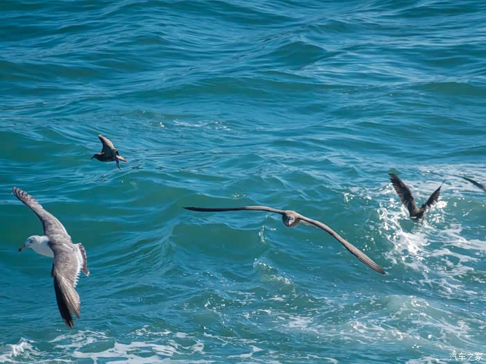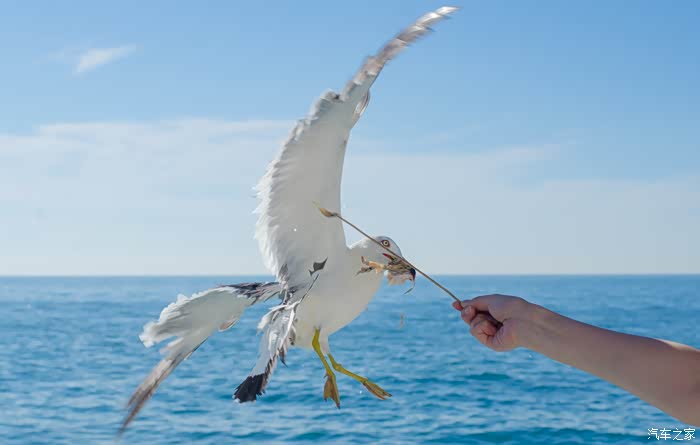 当游船开动,不知道从何处来的海鸥便聚集在游船周边,他们围绕着游船不断地飞翔盘旋,当然如果想要离它们更近一点,便可以在船上买一杯鱼食投喂这群可爱的“海上精灵”。当我用竹签将鱼食串起来举高时,不一会便会有一只海鸥从我身边飞速划过,而此时再看我的竹签上早已没有了鱼食的踪影,这样的互动显然对于我们很少来到海边的人非常有吸引力,因此游船上几乎所有的人都会来到甲板上喂食海鸥。