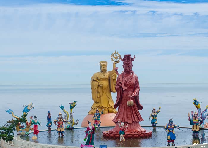 几座大殿一直延伸到海边,靠近海边则竖立着一座巨大的妈祖雕像,每天在这里都会有妈祖雕像的祈福演出,演出现场非常壮观,而且让我们意想不到的是原来妈祖的铜像演出时还会转动。从妈祖雕像下方沿着阶梯向下,便会来到另一处雕像处——太阳神。