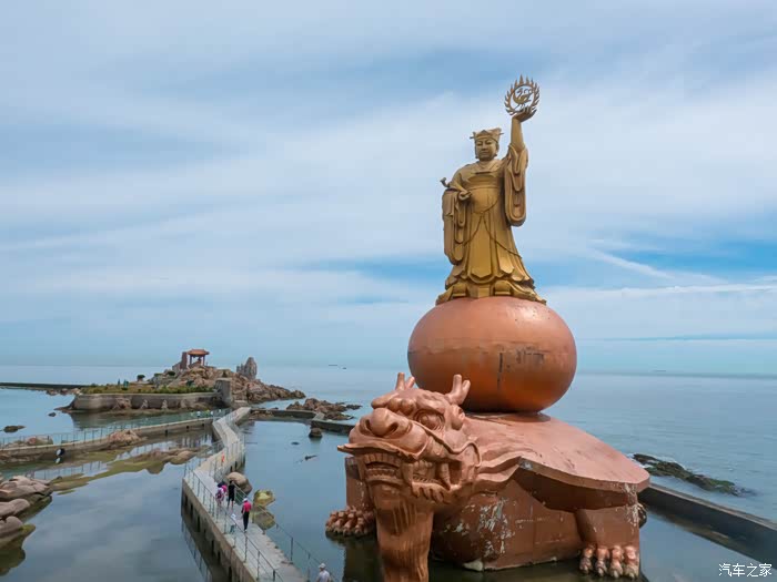 福如东海景区,是西霞口的第四大景区,正如名字所说的那样,这是一座大型福文化主题景区,和成山头南北呼应,和海驴岛隔海相望。从天空向下俯瞰,整个景区就像是一个浮在海上的巨大葫芦,葫芦在我国传统文化里也是有着“福禄”的寓意。几座大殿一直延伸到海边,靠近海边则竖立着一座巨大的妈祖雕像,每天在这里都会有妈祖雕像的祈福演出。