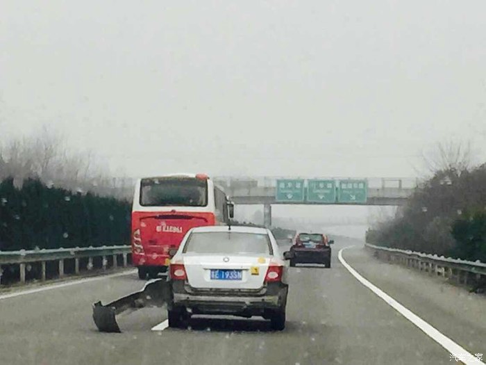 之后就是神奇汽车的故事:下着小雪的情况下,这位兄台一路任由车尾如此开着,速度还蛮快,整条高速他横扫了。后面有奥迪哥想阻止他并告知他,但是高速上的他依旧横行霸道继续开。