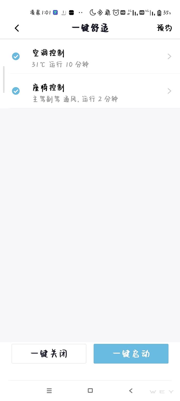 下面的功能很多。有启动车辆。车锁,后背门。寻车。关天窗。开空调,座舱清洁,座椅加热。都是可以提前预约好时间。出门后到车里空气清新。车内也不冷。太棒了。让驾乘感受得到更好的体验,如果再多加一个远程方向盘加热会更好哦,