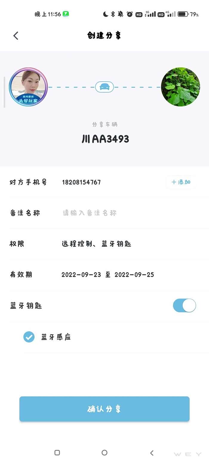 蓝牙钥匙分享。这个也是特别好的功能,可以分享给家人朋友,对方打开蓝牙进行我的邀请配对就可以使用了,还可以设置分享钥匙的时间,1小时24小时一天两天随便自己设置。设置的时间内有效,过期就使用不了!蓝牙锁车也是感应的。(离车锁门)这里大家一定要记得。地下室如果没有信号的建议还是带钥匙吧。如果手机没有信号是无法和蓝牙连接的。使用蓝牙钥匙是需要有信号的地方哦,一定记得哈?