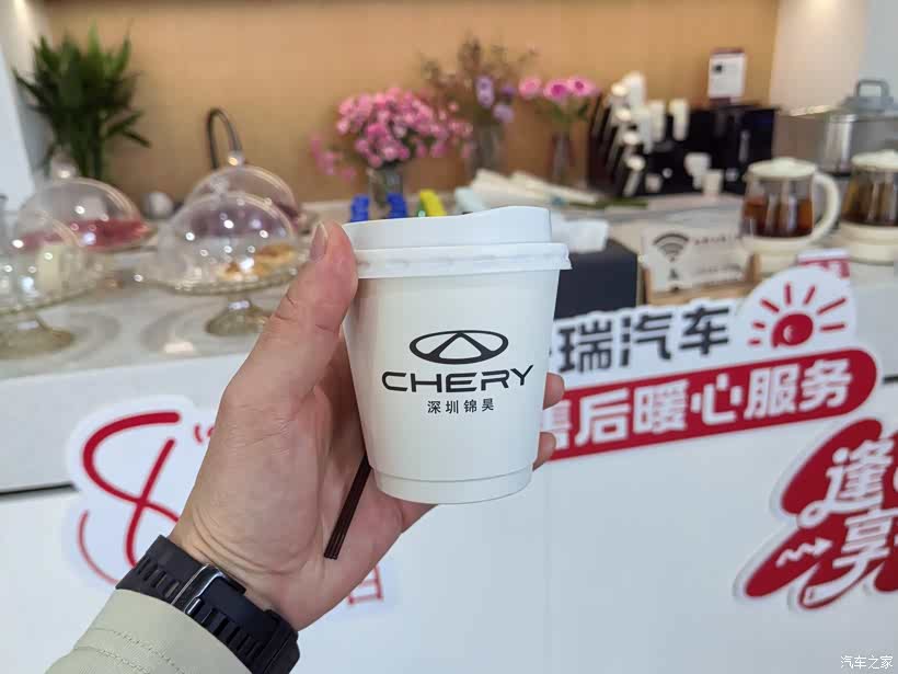 到二楼休息区坐下后,工作人员端来热气腾腾的大肉包,笑着解释“一大早过来肯定没吃早饭”,原来这家店是深圳首家提供奇瑞大肉包服务的门店,且当天恰逢爱瑞8Date服务日(每月8日、18日、28日进店有专属惊喜)。肉包个头足、馅料饱满,吃一个就饱了,期间还发现休息区水吧除常规饮品外,还提供现制奶茶,口感清爽解乏。