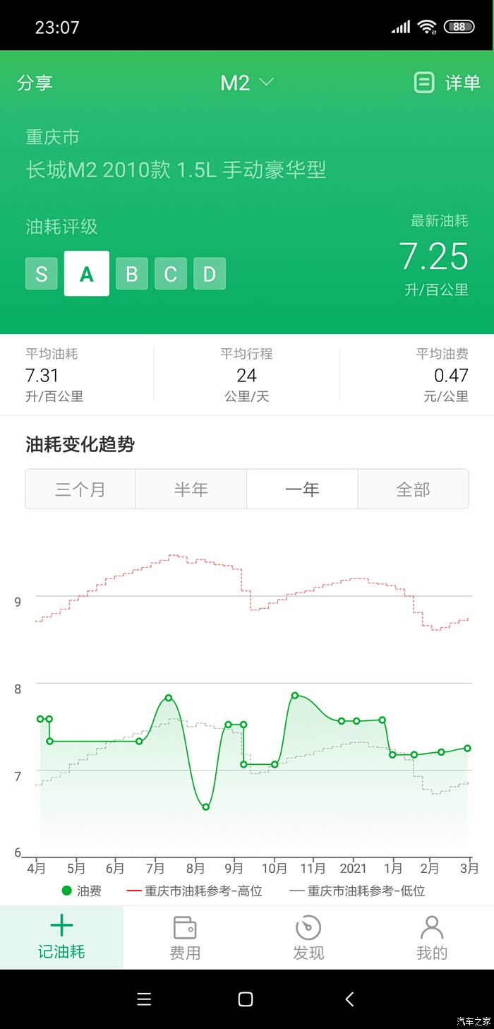 自动挡,经常跑城乡结合路段,二级公里乡村公路各种钓鱼路段,平均都是1箱油500公里左右就要去加油了。