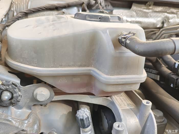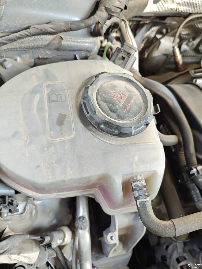 2.找到冷却液水壶。打开引擎盖,找到标有温度计符号的冷却液水壶,我觉得有一些朋友不一定知道哪个是水壶,在左上角这里,透明的壶身,有一个中间环线。