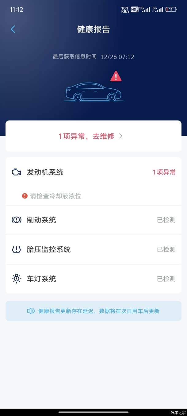 大家好,我是ccc的辣馒头,一名凌渡L车主,自22年9月提车到如今驾驶凌渡L行驶了将近35000km。早上打开车子的App,看到健康报告弹出一个红色的提醒,点开显示发动机系统异常,这可是把人给吓到了。看到原来是冷却液液位不足,赶紧去检查了一下,确实水位比较低了,琢磨着自己也不咋懂,要不要去外面看看,之前家里面的老别克就发生了漏液的问题。下面我和大家分享下我的操作过程和一些感受。
