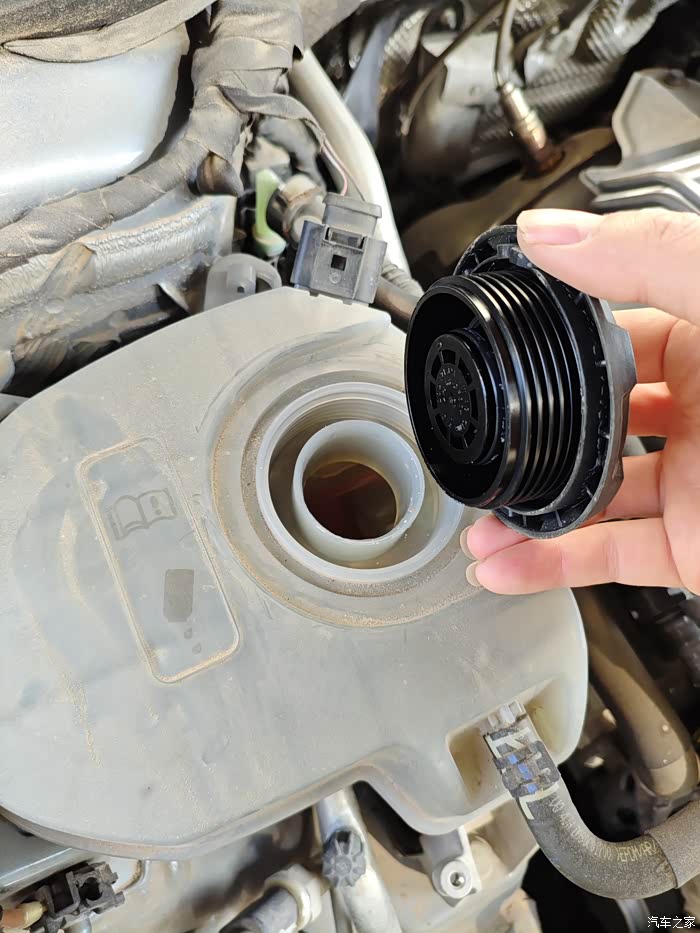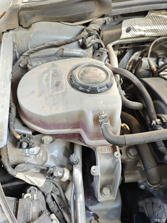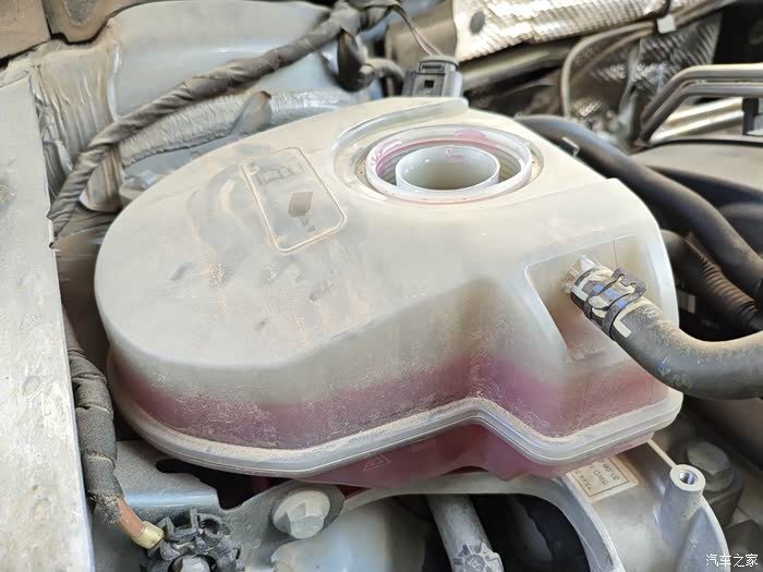 6.检查并补充冷却液。发动机运行一段时间后,关闭发动机,等待车辆冷却。因为上面的是一个中转壶,再次检查冷却液的液位,我看了下没下降多少,这让我确认了不是泄露的问题,过段时间去保养让师傅再检测下。