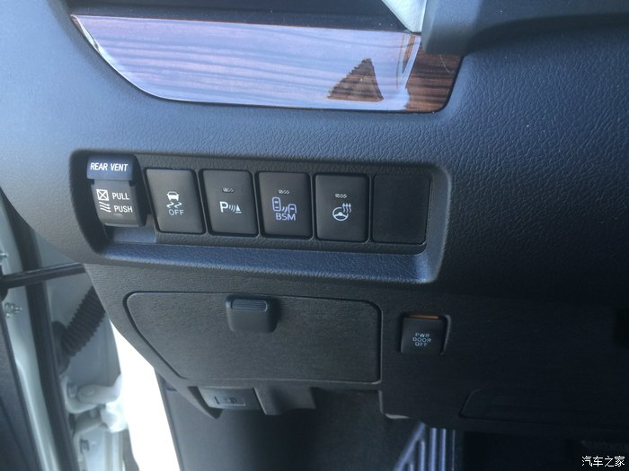高配一些特有东西,方向盘加热,盲点监测,还有倒车雷达的开关,最左边是第三排车窗的负压开启开关,能让第三排车窗打开一个缝儿。