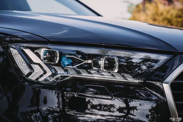 毕竟是灯厂,看家本领怎能少,全新奥迪Q7全系标配矩阵式大灯,远光可以智能调节,而我们试驾的车型搭载了奥迪最新款的激光大灯,照射距离更远,穿透性更强,激光大灯造型上是一个X,用了一块蓝色的饰板和普通大灯区别开