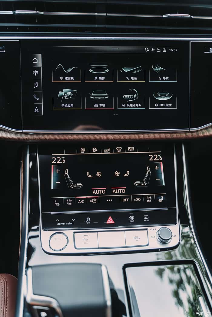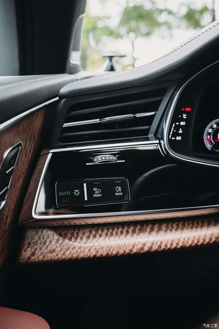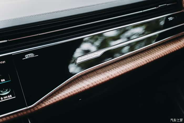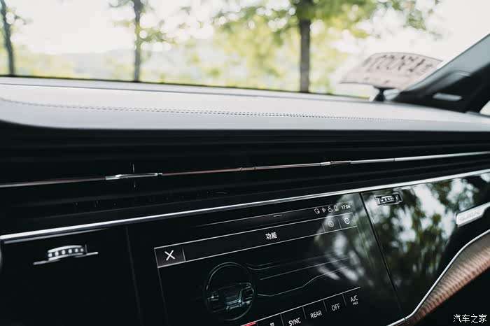 进入驾驶舱首先就会看到三块大屏以及贯穿整个中控的空调出风口,这一代的奥迪的经典设计用在全新奥迪Q7上似乎显得更为合适,在真皮、翻毛皮、烤漆亮黑饰面材质以外,奥迪还加入了一块专为中国用户设计的木质装饰条,大部分人都会觉得木质装饰会显得老气,但是用在这一套内饰设计中,却有一种画龙点睛的感觉,提升了整个内饰的质感,与这套主打科技感的内饰相互呼应,瞬间符合了豪华SUV的定位。