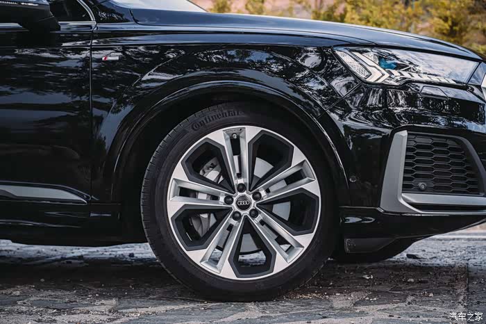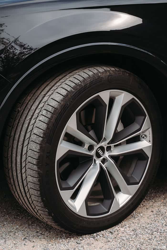 我们驾驶的全新奥迪Q7使用了一款21英寸 Audi Sport 轮圈,双5辐哑光灰显得动感十足,与车身搭配也非常协调,轮胎规格是马牌的285/40 R21