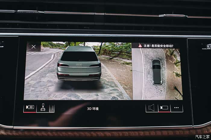 主打科技感的奥迪在360影像上也玩出了新花样,与传统的360影像不同,普通车型只能实现垂直视角,奥迪则可以真正实现环绕视角,点击中控上为数不多的实体按键,就可以显示周边情况