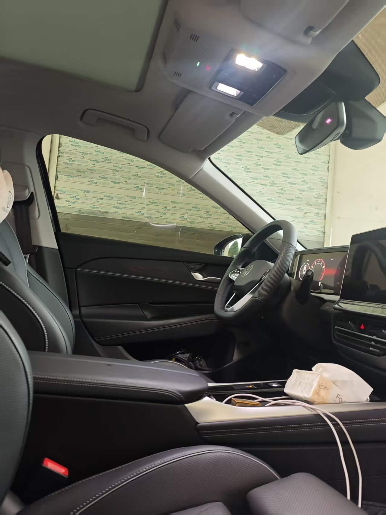 一个工作日下午去的。车已洗好,按流程验车:看铭牌(2025年6月出厂)、绕车看漆、查轮胎玻璃日期、试所有电器、听发动机声。一切OK,刷卡、办临牌、简单听销售讲了讲功能,系个红丝带合影走人。流程很快很利索