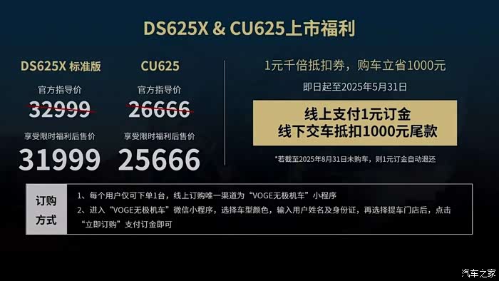 2025年“VOGE宠粉节”于今天正式在华山举行,不过小编更感兴趣的是在本届宠粉节上发布的中量级巡航CU625以及硬派越野DS625X。这一次无极发布的两款新车在售价上可谓诚意拉满,其中CU625首发限时活动价为25,666元,DS625X首发限时活动价为31,999元(萝卜三箱+4,000元)。这样的售价毫不夸张地说将直接影响到同级车型的再次价格调整。那么这两款车型又有哪些值得说道的呢?通过文章让我们一起更深入地来了解一下吧!