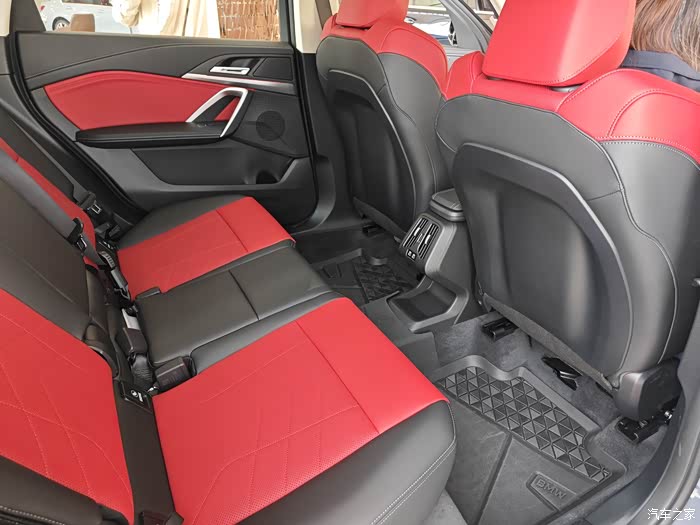 新X1这个空间确实挺大,也难怪热度这么高了,后排空间更是敲个腿都没问题,很符合我的需求。后排坐垫也很长,一直到大腿那块都有承托,而且中间没啥隆起,应个急坐3个人也是可以的。但是在车里坐了一会就觉得,这个坐垫好像填充不是那么厚,坐久了还是感觉座椅有些硬的....后排靠背能调节但是范围不是很大。