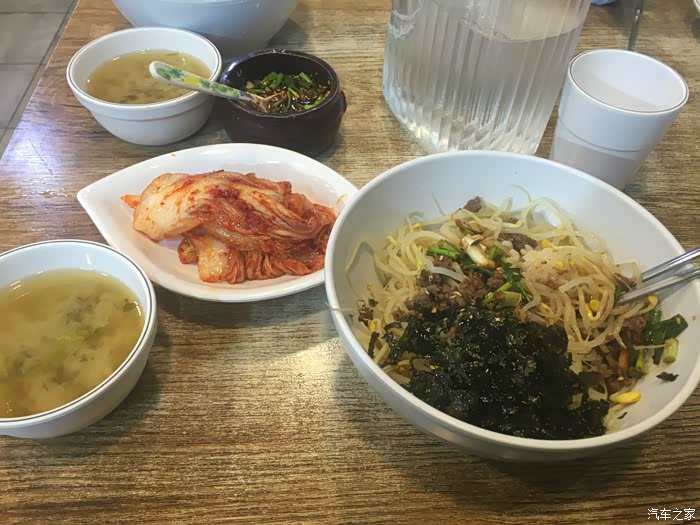 拌饭,韩国标配的大酱汤和泡菜还有海苔,当然每一餐都有冰水,据说韩国人觉得冰水非常养身