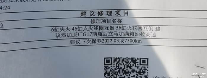 【第二次】故障灯报警是在2800公里时候,还没有换加油站,有次冷车启动感觉抖动大,过几十秒好了,然后故障码就亮了,去4s店读故障码还是第六缸断火缺缸,开单子进店维修。