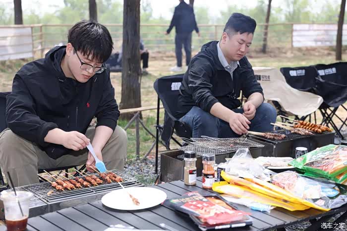 玩了一阵子,肚子也咕噜咕噜叫了。还好郑州日产工作人员很贴心,提前为我们准备了烧烤。两位师傅手艺不错,炭火温度恰到好处,烤架上的食材在高温下逐渐变得金黄酥脆,烤肉滋滋冒油,撒上孜然辣椒面,香味瞬间四溢。咬上一口,鲜嫩多汁,幸福感满满。