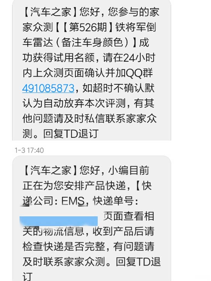 作为家家众测的铁粉,每期的众测活动我都是积极报名参加。我的凯越是2013款,厂家考虑到生产成本,把倒车雷达给减配掉了。每次在倒车的时候我本人还好,老婆总是小心翼翼,为了倒车安全,我之前也考虑过安装倒车雷达,奈何囊中羞涩,一直没舍得。家家众测第526期正好推出众测铁将军倒车雷达的活动,我看到后喜出望外,在认真填写评测计划后就一直等待着好消息的到来。果然功夫不负有心人,2019年的新年刚过,1月2日收到了汽车之家的短信通知,这也是家家众测送给我的新年大礼吧,再此感谢家家众测的所有工作人员对我的信任,我也会一如既往的继续支持家家众测,也希望自己能获得更多的众测商品。