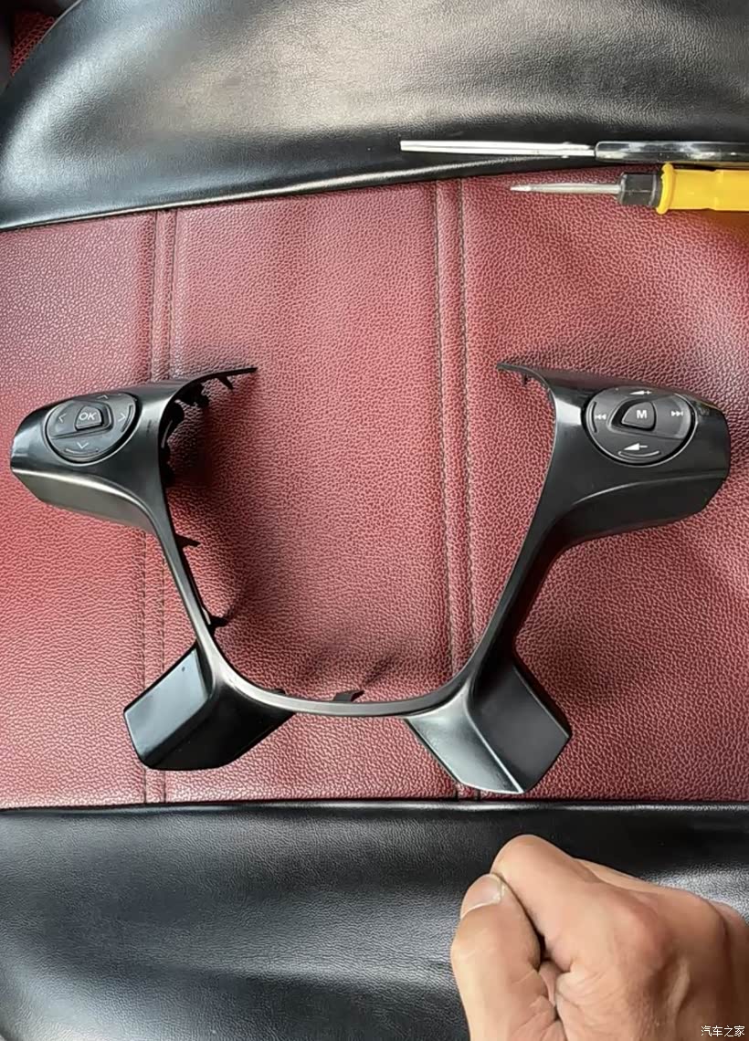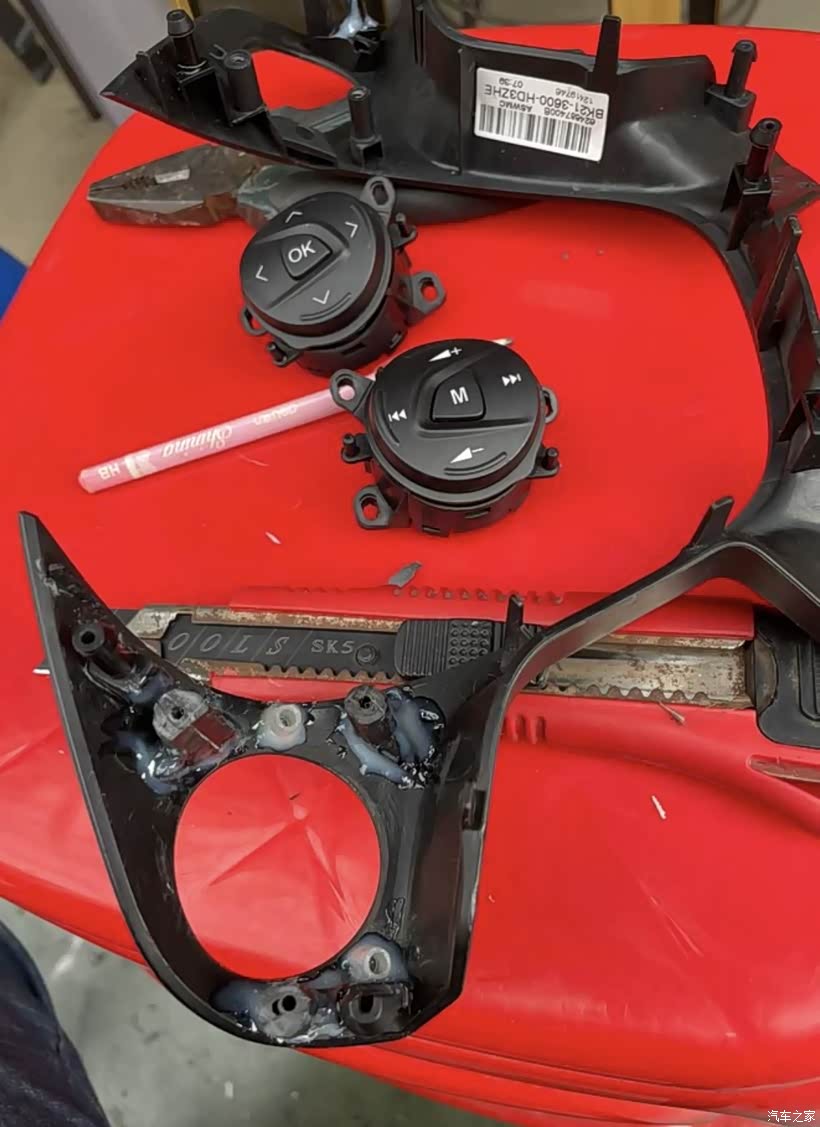 拆掉方向盘按键面板,由于是蘑菇头卡口,小心翼翼还是拔断一根卡口桩头,不过用胶粘上没影响。