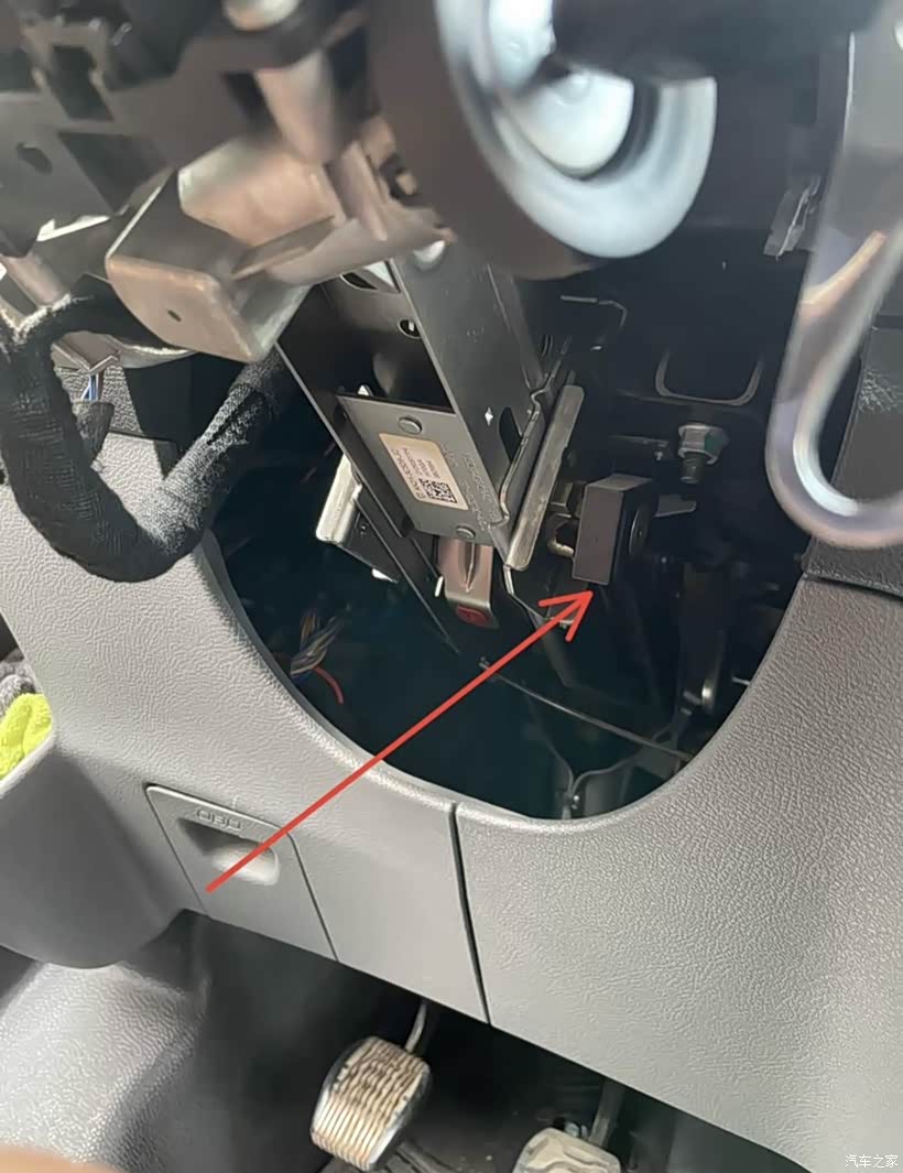 开拆,拧掉方向柱护罩下一个螺丝,转动方向盘漏出两边卡口,顶一下就拆掉护罩了,题外话:(箭头所指扳动就可调节方向盘上下前后,有兴趣可以试试)