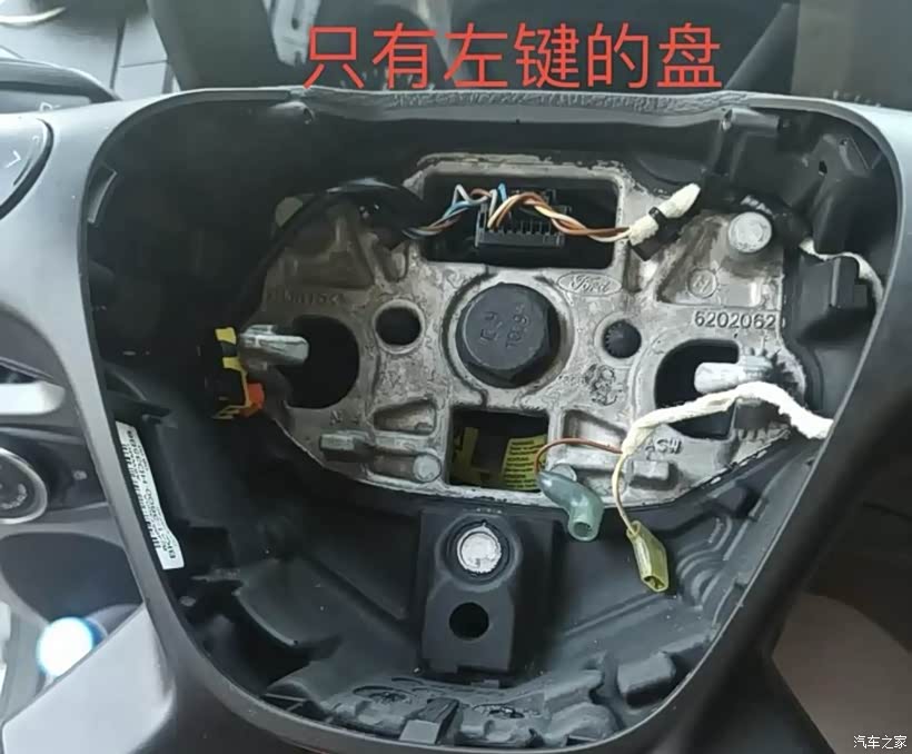 卸掉气囊后,可以看到方向盘内部线束布局,右边只有喇叭线。
