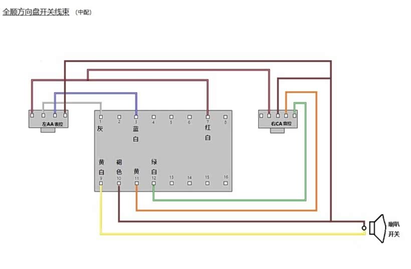 自己绘的线路图,明白针脚定义就行,即增加绿白和黄两条线,小灯从左键红白色线接,负极都从喇叭褐色线串接。