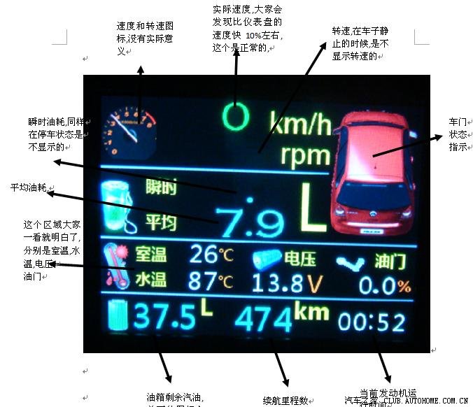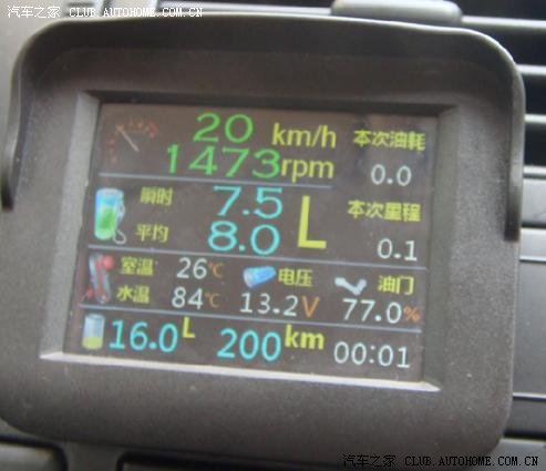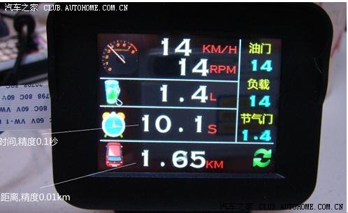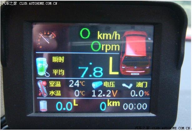 彩色显示VSO,可以用来显示:瞬时油耗,转速,实际车速(用GPS实际测试该速度为车子真实速度,仪表盘显示的速度快10%,不知道是不是为了我们不容易超速故意设置的),水温,室温,数字显示油箱剩余油量,续航里程,本厢油的平均油耗,油门踏板深度,蓄电池电压,行驶时间,本次行程距离,本次耗油,本次平均油耗,整点报时,节气门开度,故障代码显示,车门状态显示等很人性化和实用的功能,让你对爱车的状态了如指掌.根据一年多车友们使用下来的情况来看,完全可以取代原有仪表盘,有车友使用之前担心装在A柱会影响视线,造成不安全因素,实际使用一段时间后看数据非常方便,弯曲不用担心安全问题,而且弯曲取代原有仪表盘,放心的按照行车电脑显示的车速行驶,不会被摄像头拍到超速.