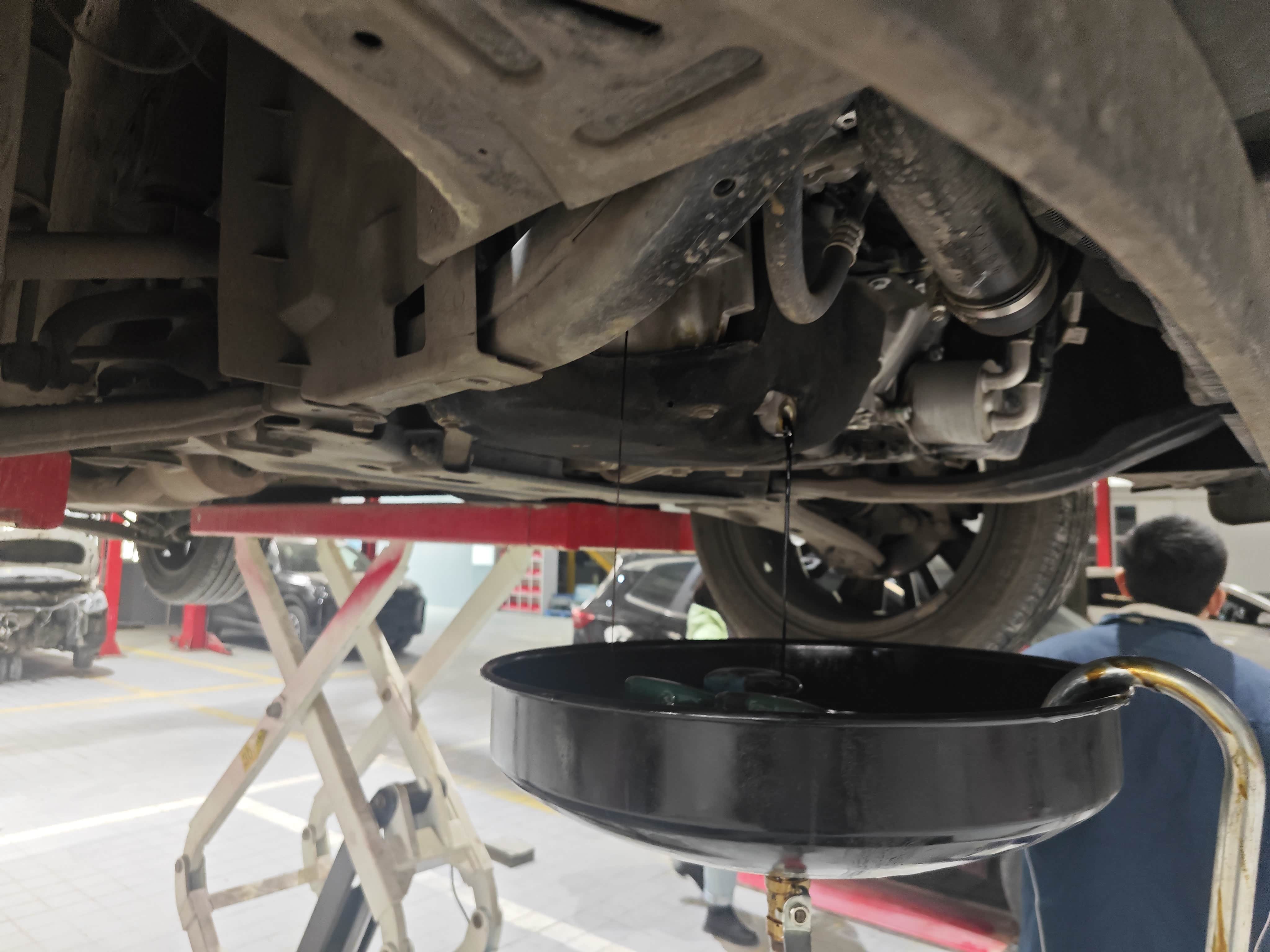 师傅先把车升起来,拧开油底壳螺丝放旧机油。