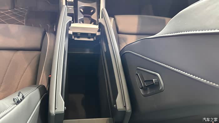 扶手箱表面有植绒,质感很好。对开式的设计储物空间看着还行,放几瓶矿泉水应该没什么问题。