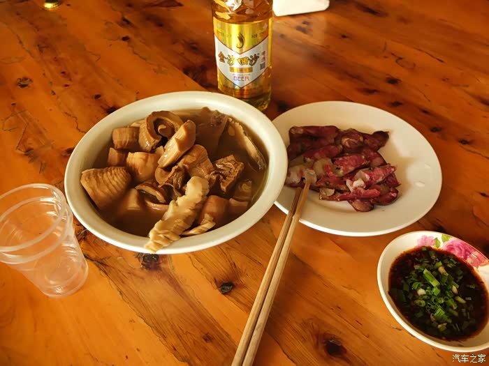 在镇上找了一家小饭店100元三菜一汤,一瓶啤酒。趁天没有完全黑,赶紧铺床。
