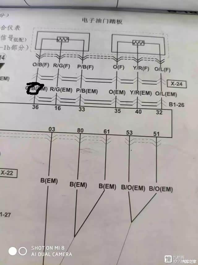 油门踏板位置反映驾驶员的动力需求,该传感器把油门的机械位置变化转化成电信号发送给控制器。油门位置信号和发动机转速信号是电控系统中的最基本信号。油门踏板内部有两个滑动变阻器,共有6条线,每个变阻器3条线,电源,信号,接地。而且两个信号,APP1的电压是APP2的2倍。故障码是APP1电压低,主要检查线路是否接地或者工作电压偏低的情况。检查发现,有条粉红黑色的线,电压异常。分析线路图,线路中有插头X-24有问题。这个X-24插头在车子右侧的发动机电脑旁边,内部的粉红黑色的线的插针脱出