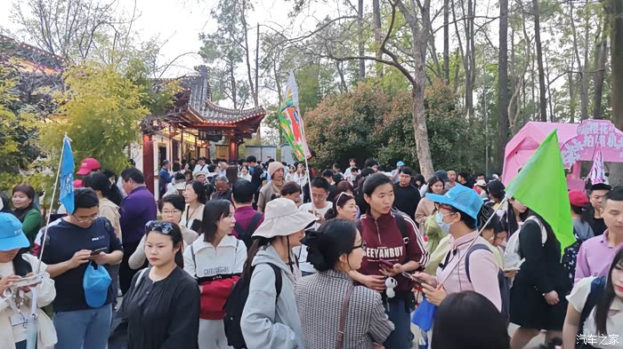 武汉的樱花应该是全国比较知名的,很漂亮,当然来的人也特别多,看看这些旅游团,乌央乌央的全是人,我们实在是没有预想到周末这么多人来看樱花,我们本来还想在车跟前合个影,最后发现停车都没地方,好多车友,最后没办法就把车子停到了离嗯东湖几站路远的小区里面。