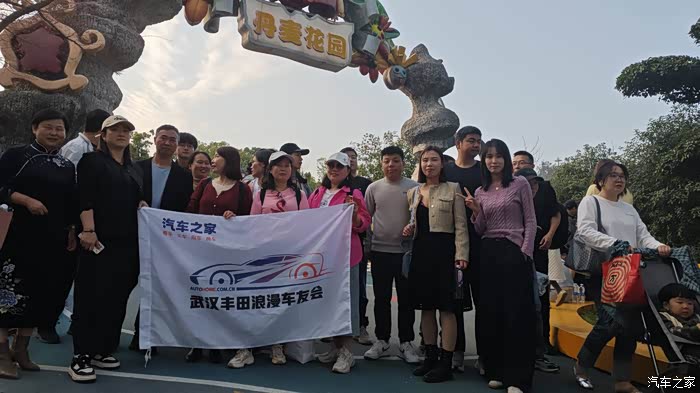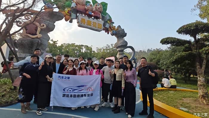 当然也少不了我们车友会的重头戏,大家一块儿合影留念,来樱花园这边拍张照,只有在这个丹麦花园的门口,人还比较少,我们找了一个空场地,找了个路人给我们拍了一张合影。