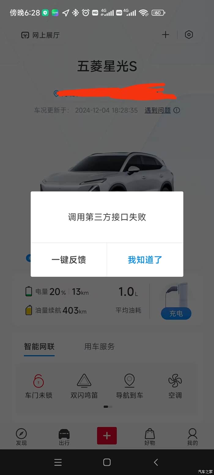 晚上6:00多,想远程解锁车辆,提示调用第三方接口失败。大概1个小时左右恢复。