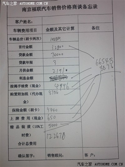 8月28日去交了订金 办了按揭~正好4S店有一辆蓝色现货!老婆一只喜欢白色!其实我个人也喜欢白色 不过因为车子已经卖了1个月 没车实在不方便 ~所以软磨硬泡老婆 !蓝色就蓝色吧~不行咱以后改色! 我办的按揭是福特金融!首付20%,贷款8W!找朋友装潢便宜了2000元!南京价格翼博必须加5000元装潢提车!朋友给了我3000元!我选了3200元膜,和400元倒车雷达!4S店的朋友还给我优惠了200元!