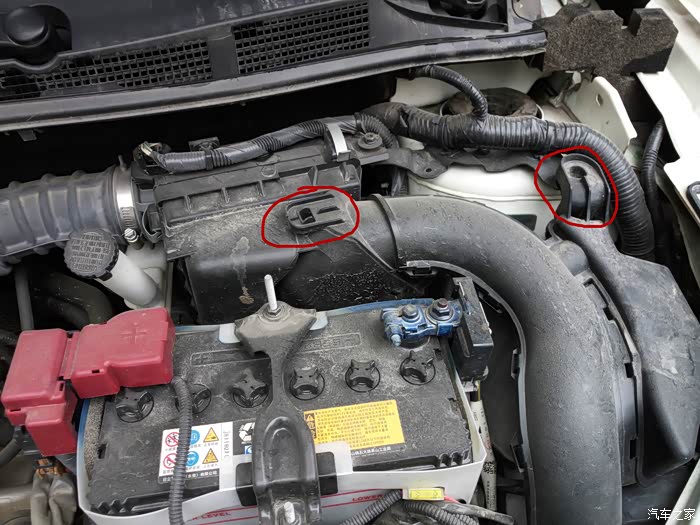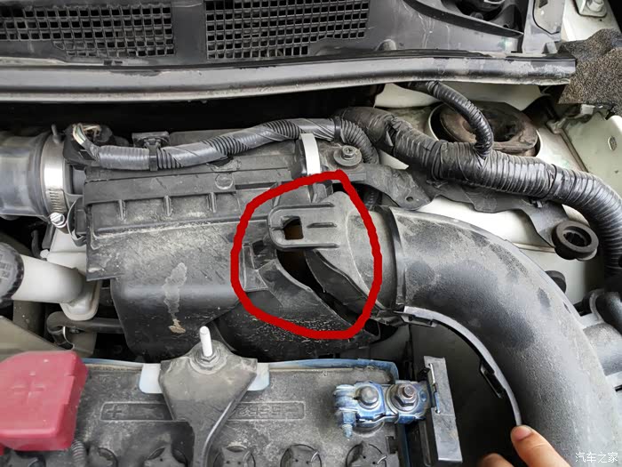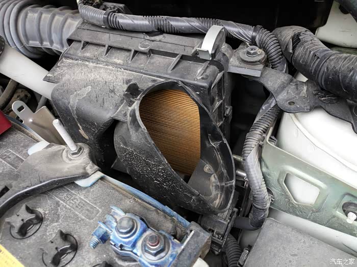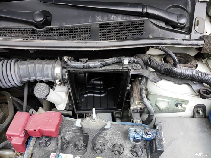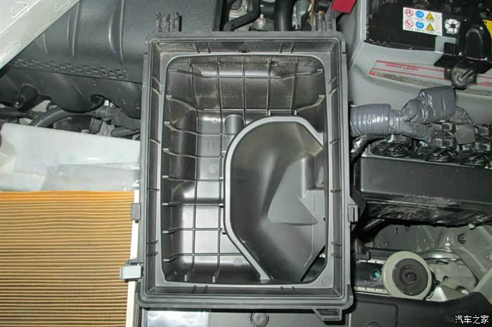 打开引擎盖。右后方,电瓶旁边的吸气管就是【空气滤芯】所在的位置。