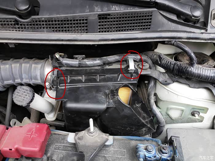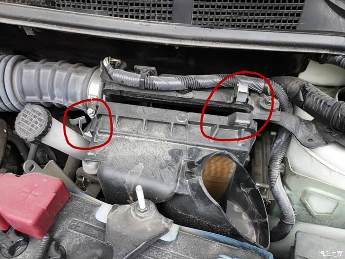 接下来就是打开固定【空气滤芯】盒子上的两个卡扣。注意一会安装的时候下面有两个卡口需要对准。