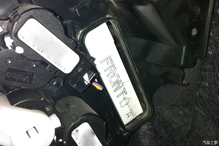 这时候我们就看到了旧的【空调滤芯】。白色【空调滤芯】英文F的上面有一个”拉手“,慢慢拉动拉手将【空调滤芯】取出,如果拉断了,就稍微用力直接取出。