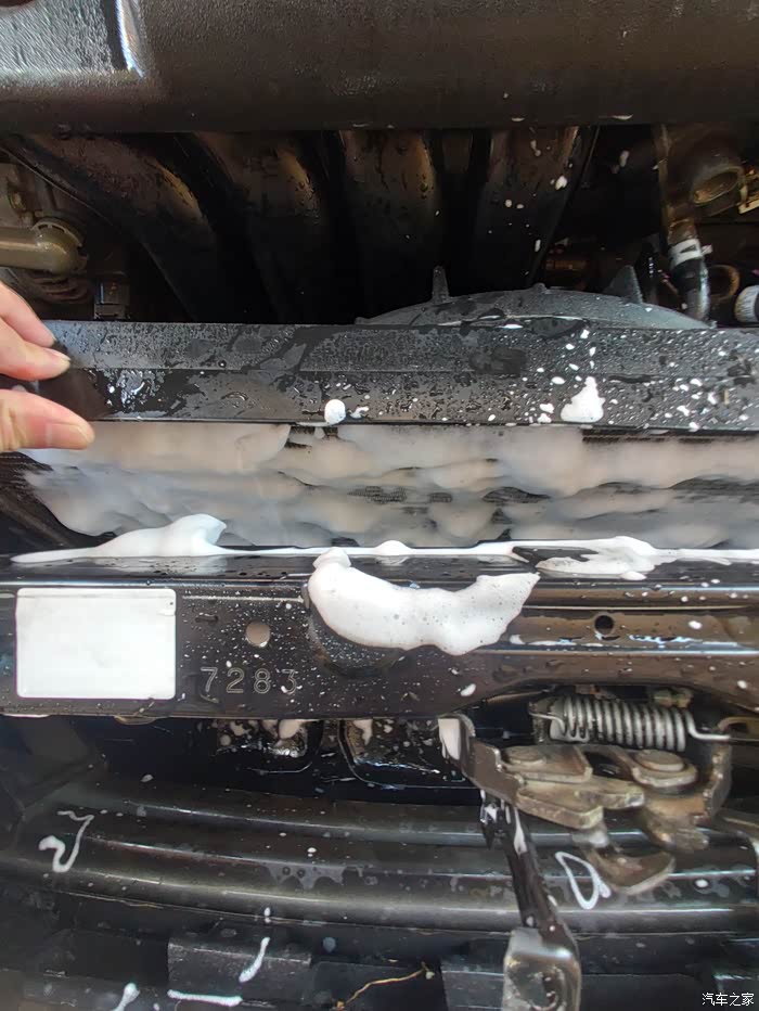 在把中网拿掉 也是两个螺丝 ,检查一下前面空调散热器也就是冷凝器 表面虽然没有挂什么东西 但是表面一层附着物 这么多年铝片颜色已经看不见了 影响散热 直接清理一下