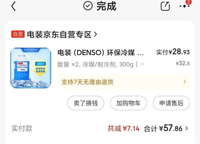 原厂为电装制冷剂 那咱就买电装的 京东自营 两桶57元包邮 每桶300g