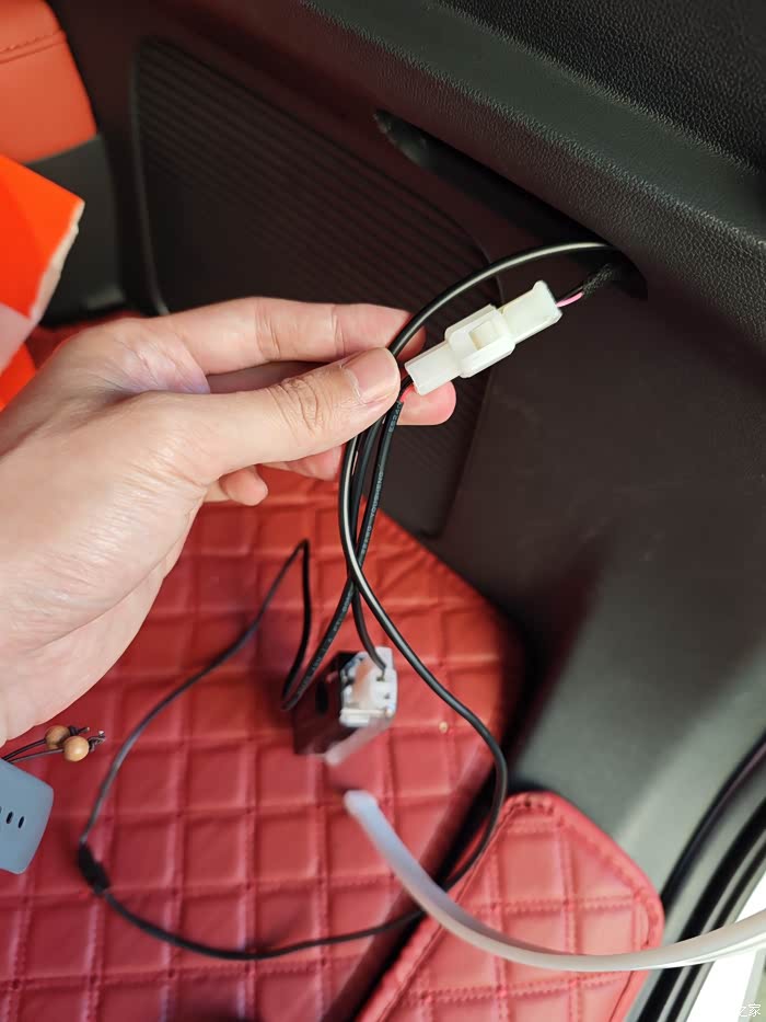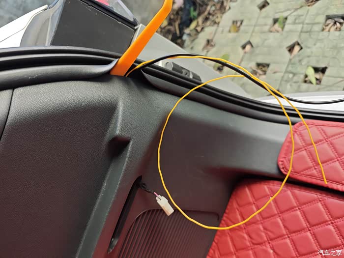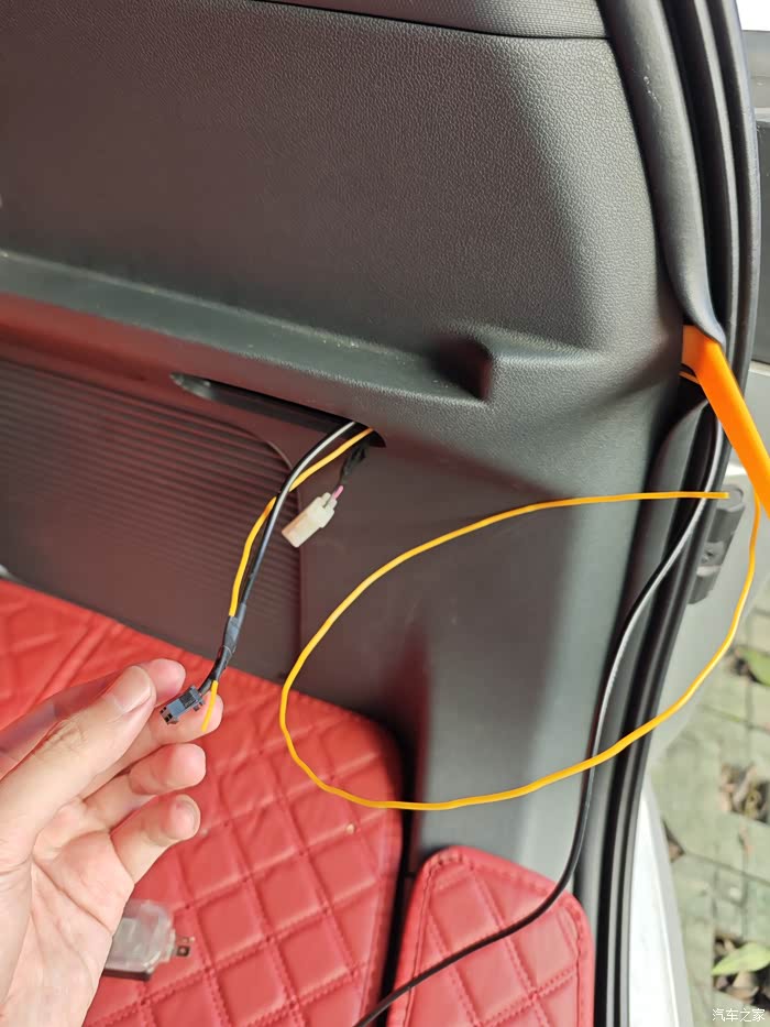 5,关键一步来了,把灯带插口从翘起的口传过去到后备箱灯的位置