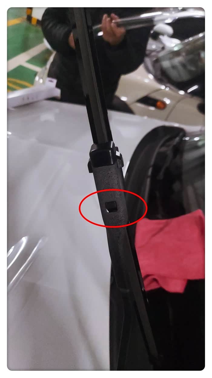 新雨刮顺着摆臂槽位安装进去即可,下图圆圈内的按钮卡主后就说明安装到位。不过这个雨刮的按钮接口比原车的小了一点,按钮位置还留有大概1/3,不过这个只是定位,不影响使用。